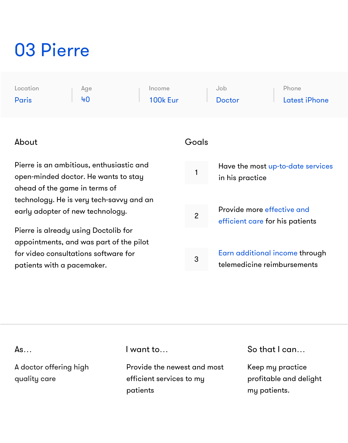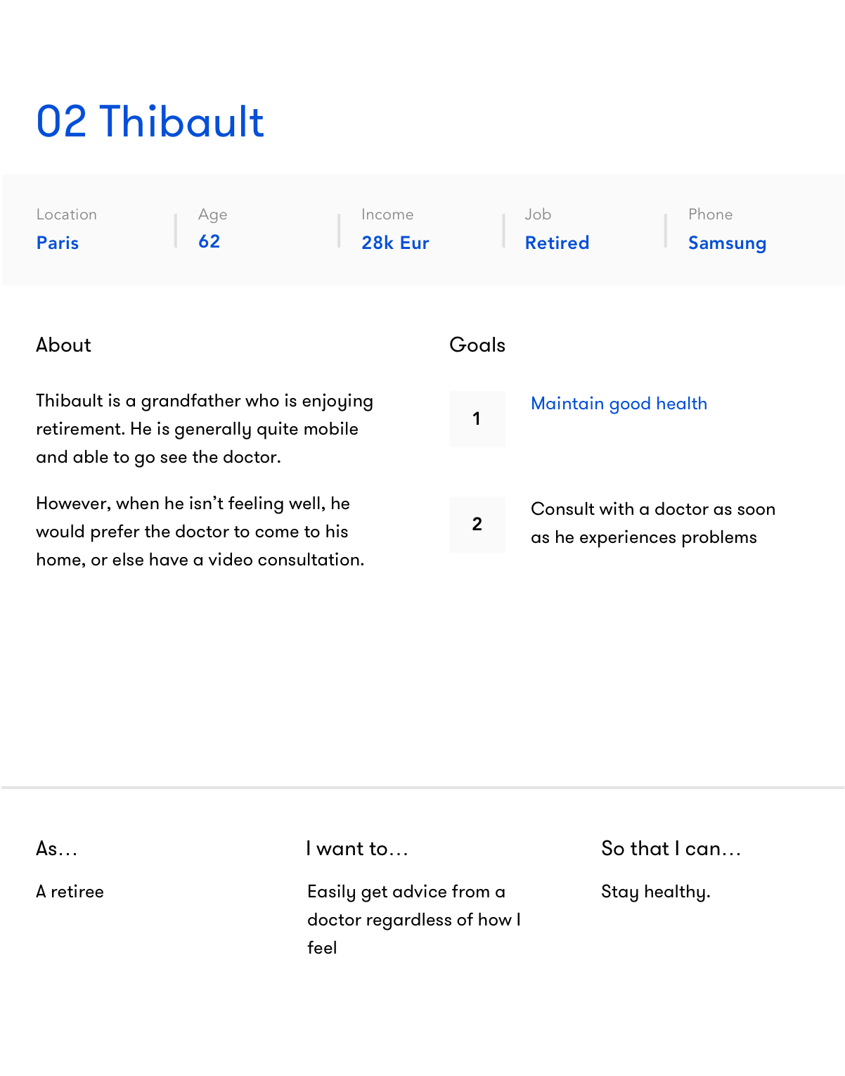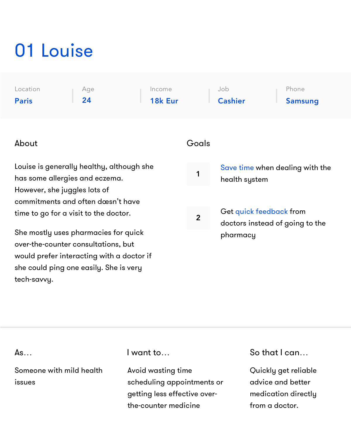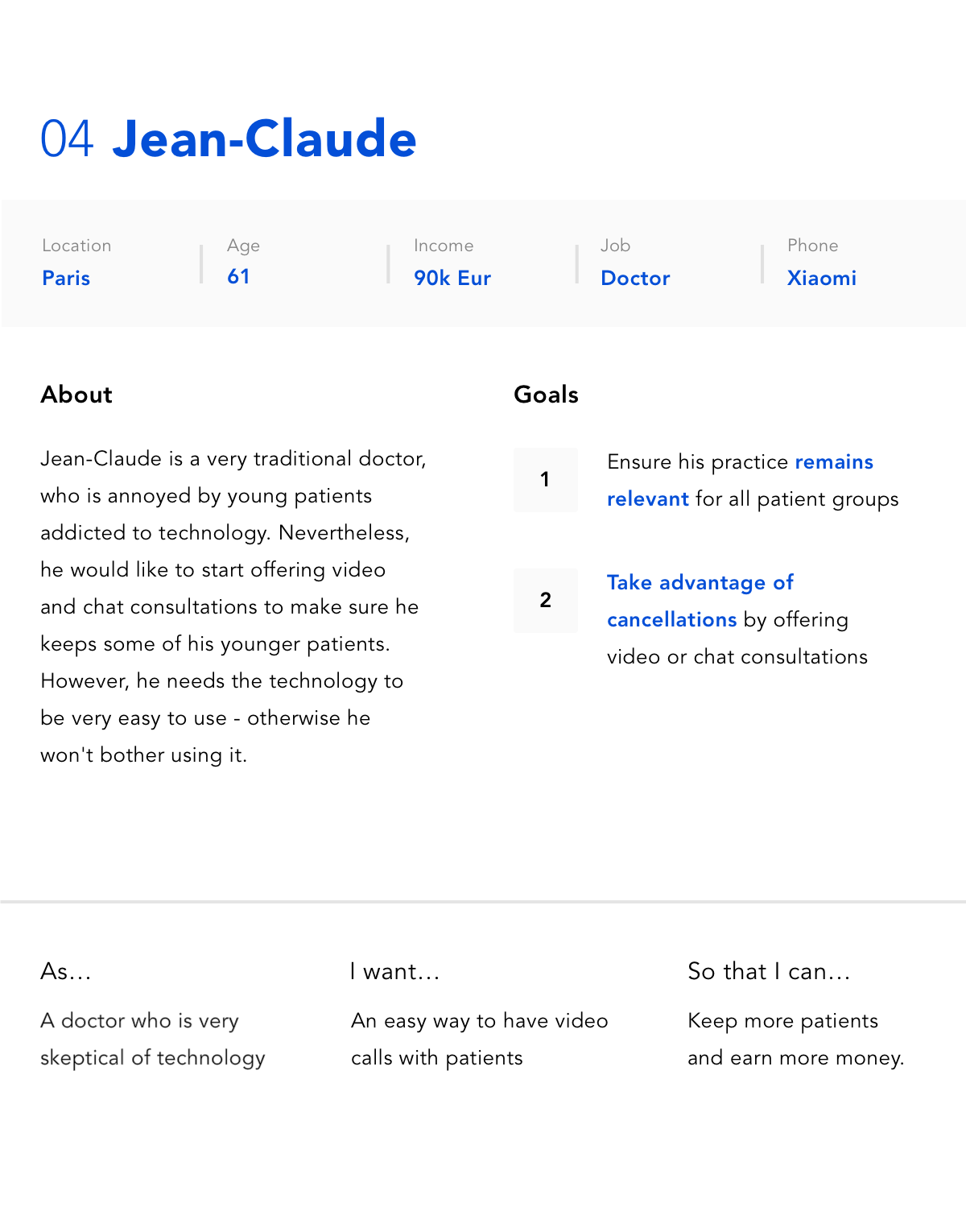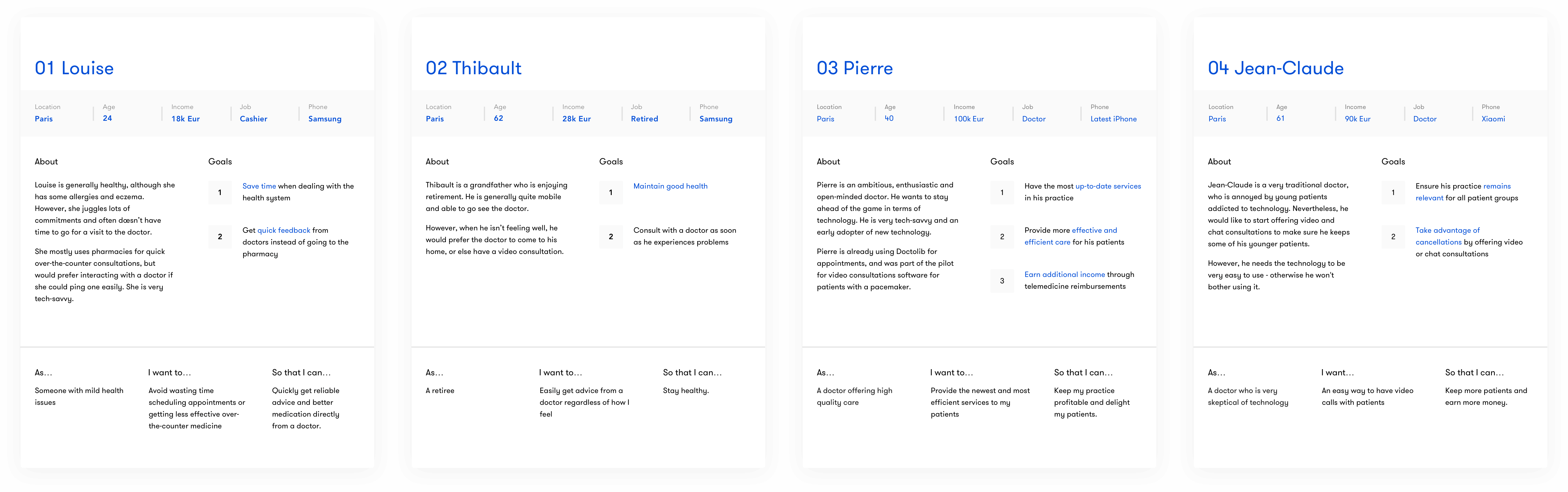 The original list of user personas was too broad, so I narrowed it down to two patients and two doctors. I wanted to get this stage very clearly defined to ensure that we would have a guide for weighing future design decisions against - this was important for an app for which the target audience could potentially be the entire population.